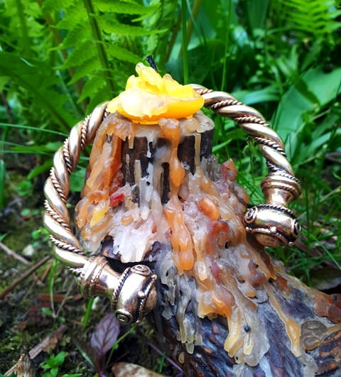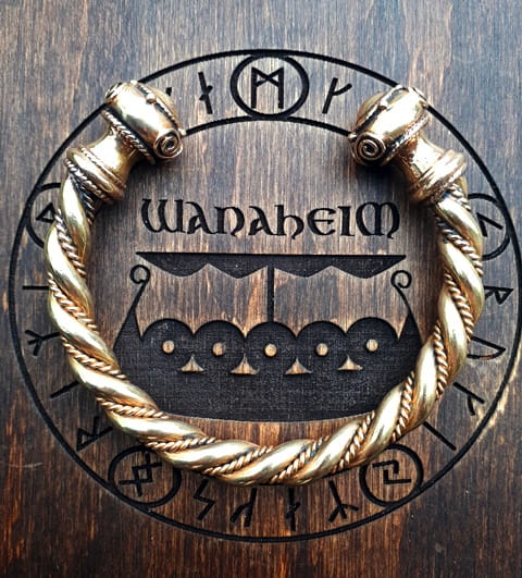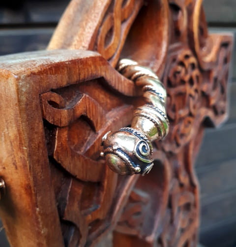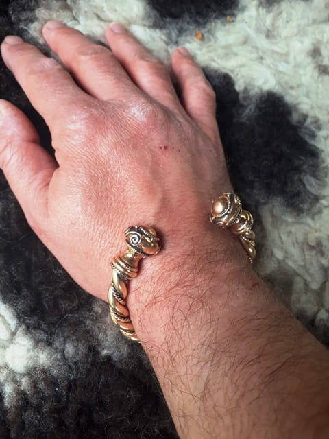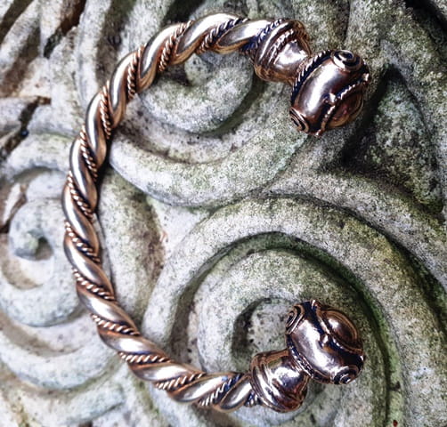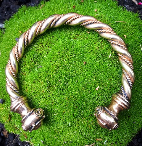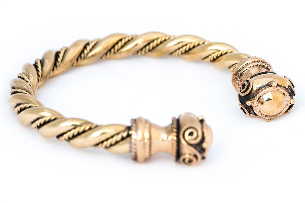 Bardzo masywna, ręcznie skręcana, męska bransoleta wykonana z brązu. Charakterystyczne wśród Celtów zdobienie biżuterii różnego rodzaju spiralami - podwójnymi, potrójnymi czy poczwórnymi ukazuje balans między wewnętrzną siłą świadomości, a jej zewnętrznym kształtem. Spirale mogą reprezentować fale wody, kosmos, niebiosa, a te zgodne z ruchem słońca - harmonię z ziemią.