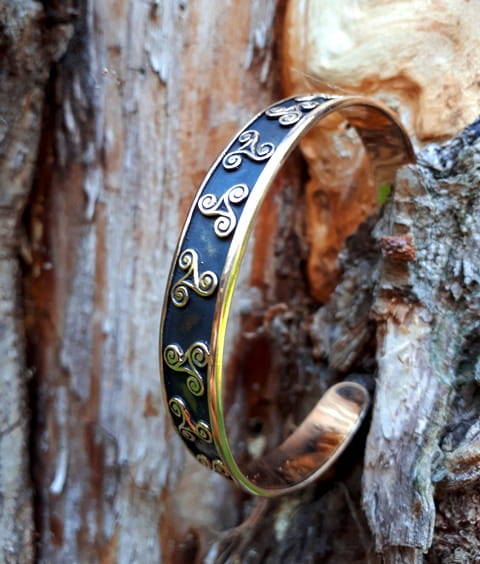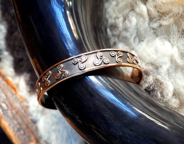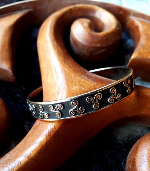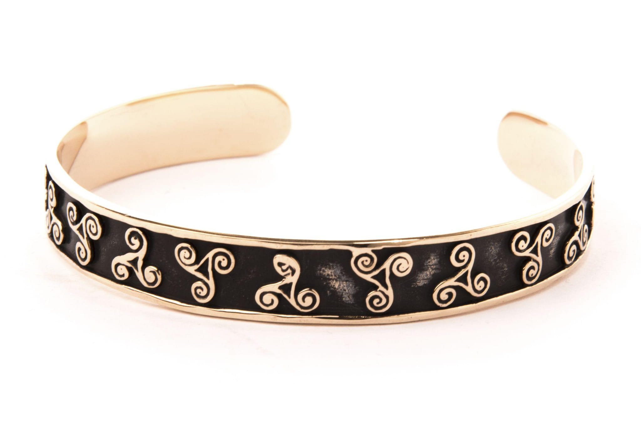 Celtycka bransoleta wykonana z brązu zdobiona triskelami. Celtowie uznawali trzy główne żywioły (ziemie, wodę i powietrze), a triskel jest ich graficznym odzwierciedleniem. Zdobienie bransolety ciągiem znaków w kształcie triskelionu symbolizuje upływ czasu dzieciństwo - dojrzałość - starość ale także wschód - zenit - i zachód słońca. Precyzyjnie wykonana bransoleta jest ciekawą propozycją zarówno dla kobiet jak i mężczyzn, a ponadczasowe wzornictwo świadczy o jej wyjątkowości. Brąz jest materiałem na tyle plastycznym, że bransoletę bez problemu dopasujemy do wielkości nadgarstka.