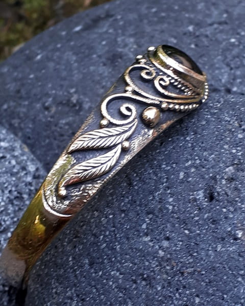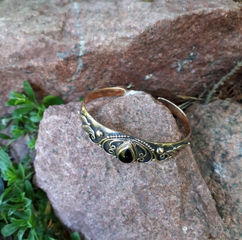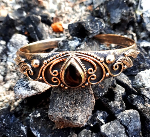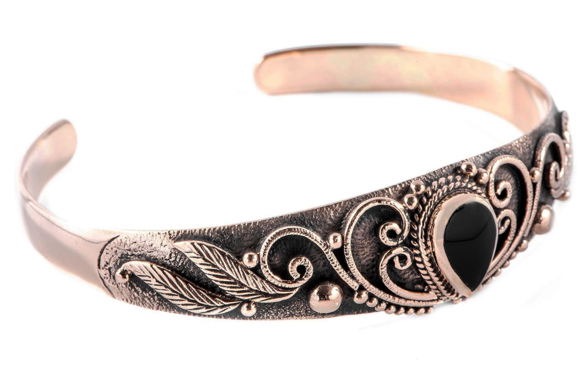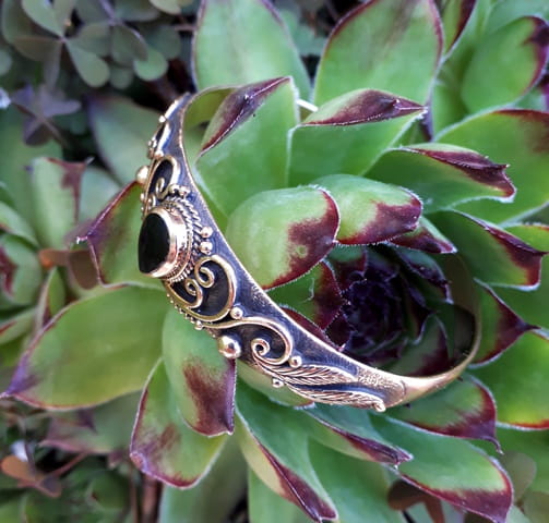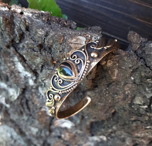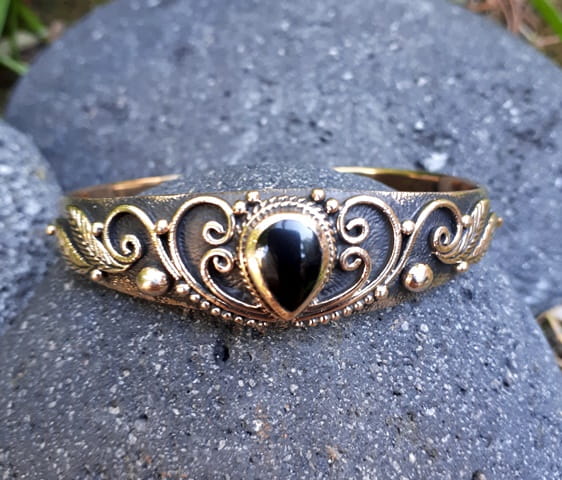 Ręcznie wykonana bransoleta z wysokiej jakości brązu. Precyzyjnie wykonany średniowieczny ornament z centralnie umiejscowionym czarnym onyksem sprawia, że bransoleta nie tylko harmonijnie komponuje się ze średniowiecznym strojem, ale również idealnie koresponduje z teraźniejszymi trendami w modzie. Spirale jako ciągłóść ludzkiego życia w połączeniu z subtelnie wyprofilowanymi liśćmi decydują nie tylko o wyjątkowości prezentowanego rękodzieła ale przede wszystkim o kunszcie rękodzielniczym rzemieślnika obrabiającego tak wymagający materiał jakim jest brąz.