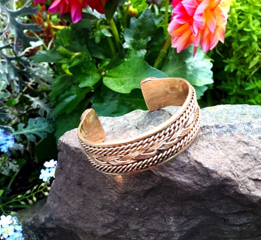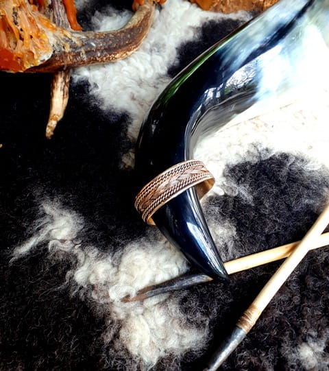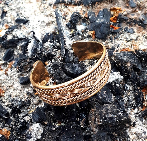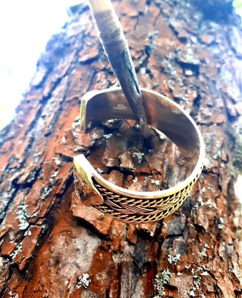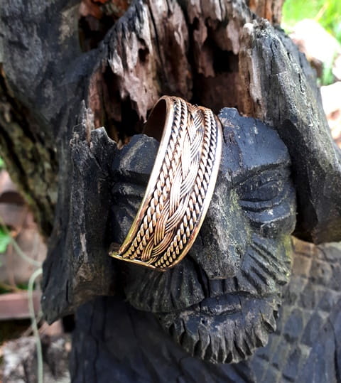 Ręcznie wyplatana bransoleta z brązu we wczesnośredniowiecznej, wikińskiej ornamentyce. Splot 12-tu pojedyńczych drutów precyzyjnie zespolonych na końcach podkreśla rzemieślniczy kunszt tego arcydzieła. Bransoleta jest na tyle elastyczna, że bezproblemowo dopasujemy ją do wielkości nadgarstka.