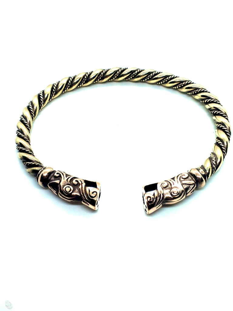 Bransoleta wikińska wykonana z wysokiej jakości brązu. Głowy wikińskich bestii osadzone na końcach ręcznie skręcanych brązowych drutów są dopełnieniem kunsztu tego rękodzieła. Projektując bransoletę inspirowaliśmy się znaleziskiem z Gotlandii w Szwecji. Bransoleta jest bardzo precyzyjnie wykonana z dużą dbałością o szczegóły. Mimo upływu czasu, ponieważ znalezisko pochodzi z okresu wczesnego średniowiecza, wzornictwo wydaje się być ponadczasowym i ta wikińska bransoleta będzie idealnym dodatkiem do dzisiejszego ubioru.