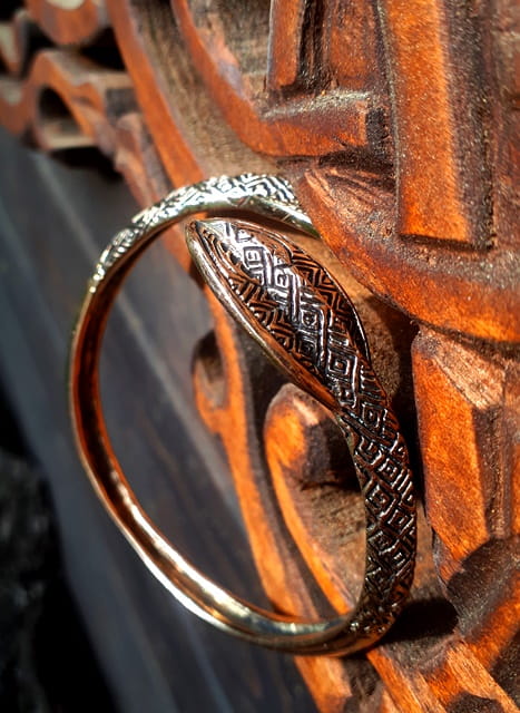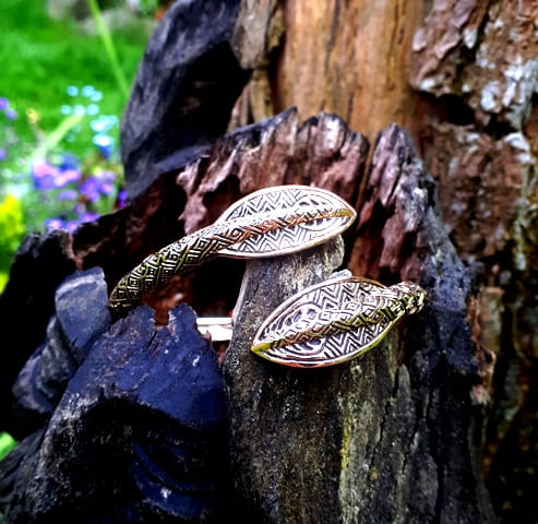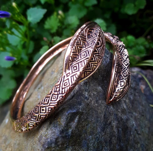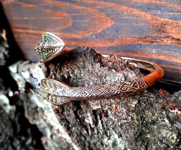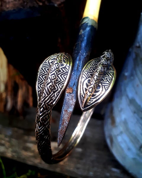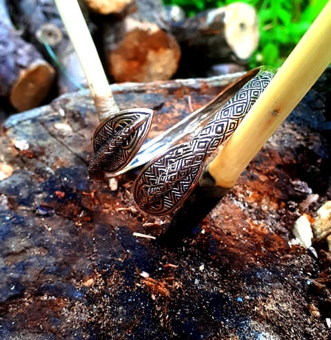 Masywna wikińska bransoleta wykonana z wysokiej jakości brązu. Forma bransolety, zakończenia w kształcie grotów i zdobienie nawiązują do znaleziska z okresu wczesnego średniowiecza. Skandynwscy rzemieślnicy oprócz motywów zwierzęcych, różnego typu smoków, wijących się bestii wyrabiali bizuterię na kształt przedmiotów będących symbolem religijnym (Młot Thora) czy atrybutami wojownika (topór, grot itd..). Otwarta forma bransolety GROT pozwala na bezproblemową regulację i dzięki temu odpowiednie dopasowanie do wielkości nadgarstka.
