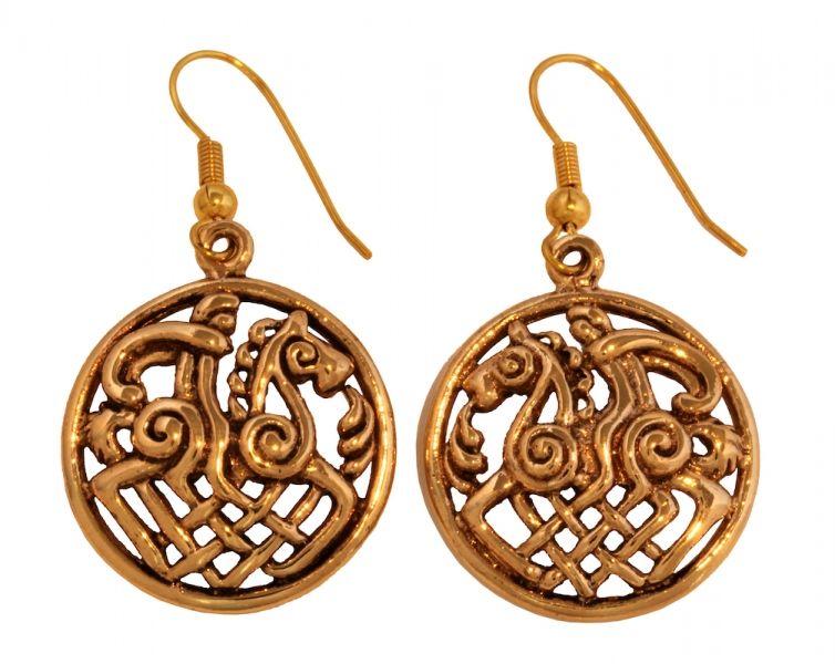 Piękne, okrągłe kolczyki z germańskim bogiem Odynem na koniu Sleipnirze. Ważną cechą Sleipnira jest posiadanie nie czterech, a ośmiu nóg i możliwość poruszania się nie tylko po ziemi, ale w powietrzu i po powierzchni wody. Sleipnir spłodzony został przez innego z bogów nordyckich Lokiego.