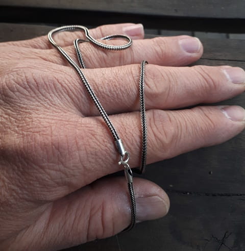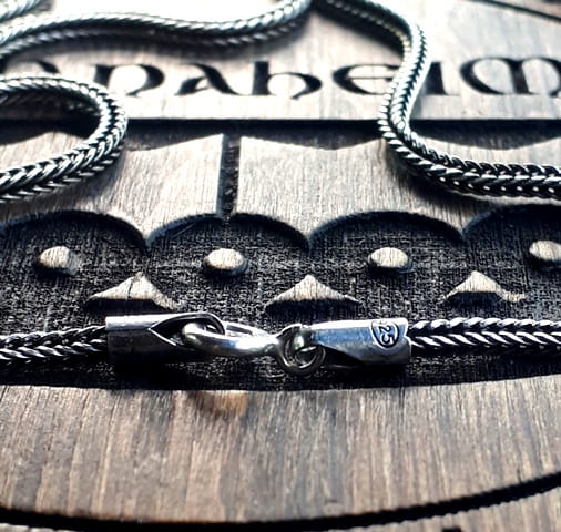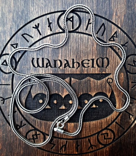 Naszyjnik wykonany ze srebra próby 925. Dodatkowo został poddany procesowi oksydacji co pozwoliło wyeksponować precyzyjnie wykonany splot. Jego uniwersalność sprawia, że dobrze komponuje się nie tylko ze strojem średniowiecznym, ale również bezproblemowo dopasujesz go do współczesnego ubioru.