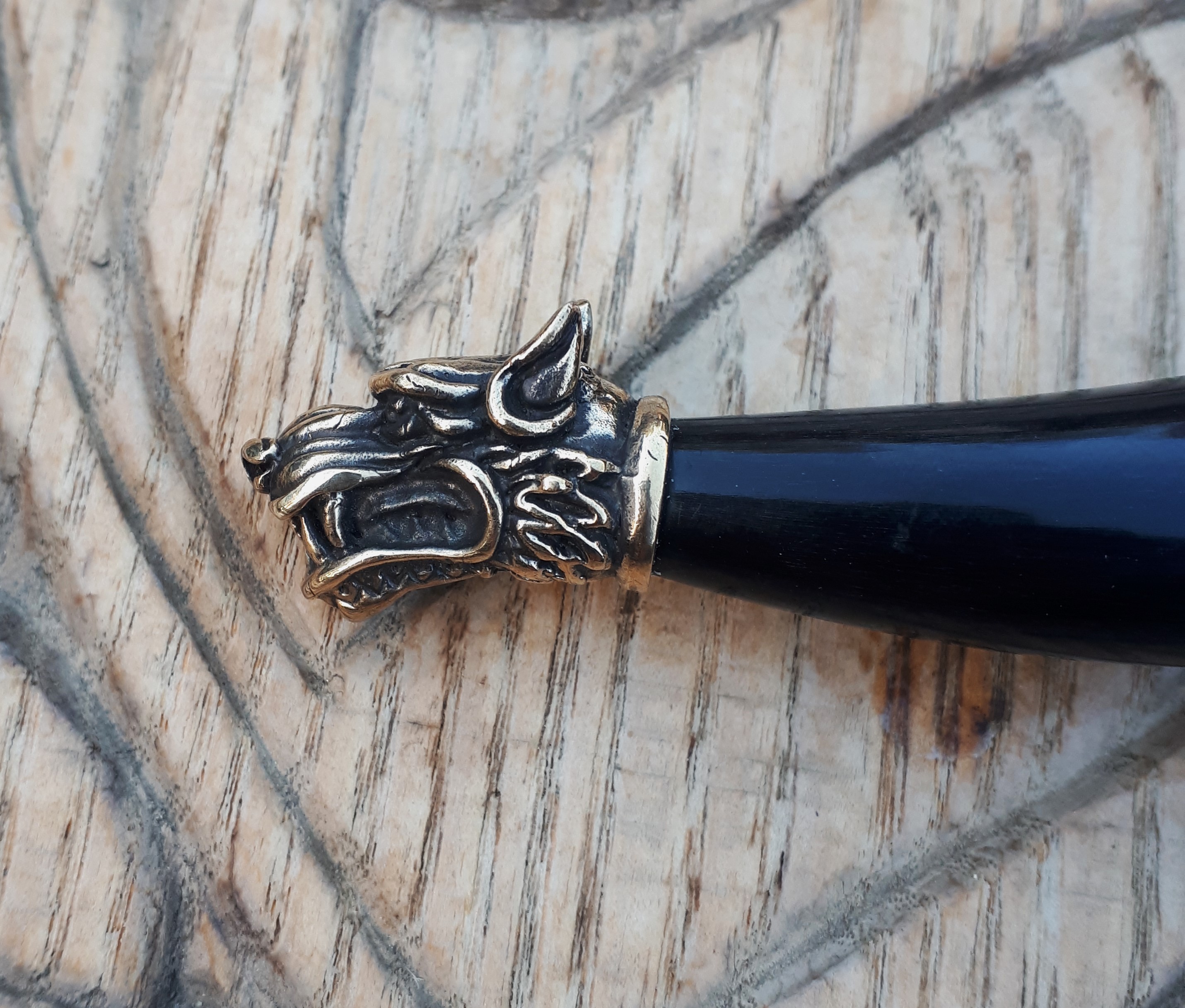 Zakończenie rogu zostało okute głową wilka wykonaną z wysokiej jakości brązu.