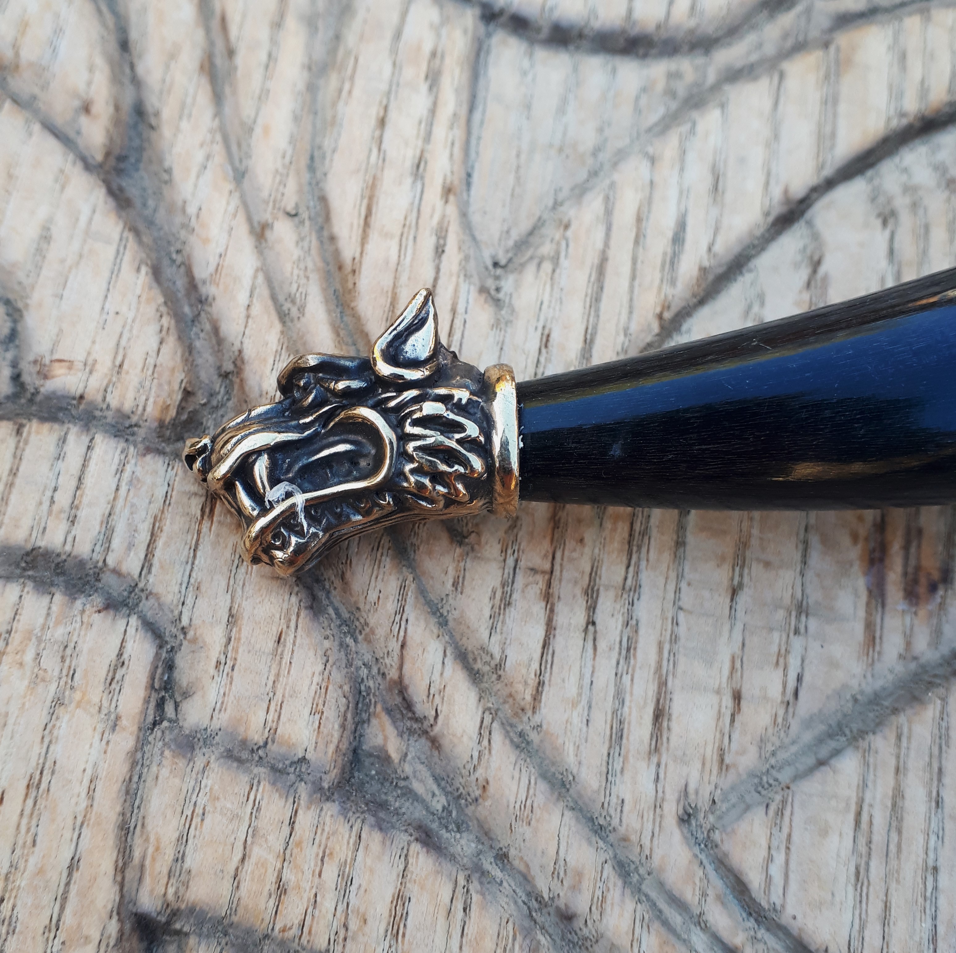Zakończenie rogu zostało okute głową wilka wykonaną z wysokiej jakości brązu.