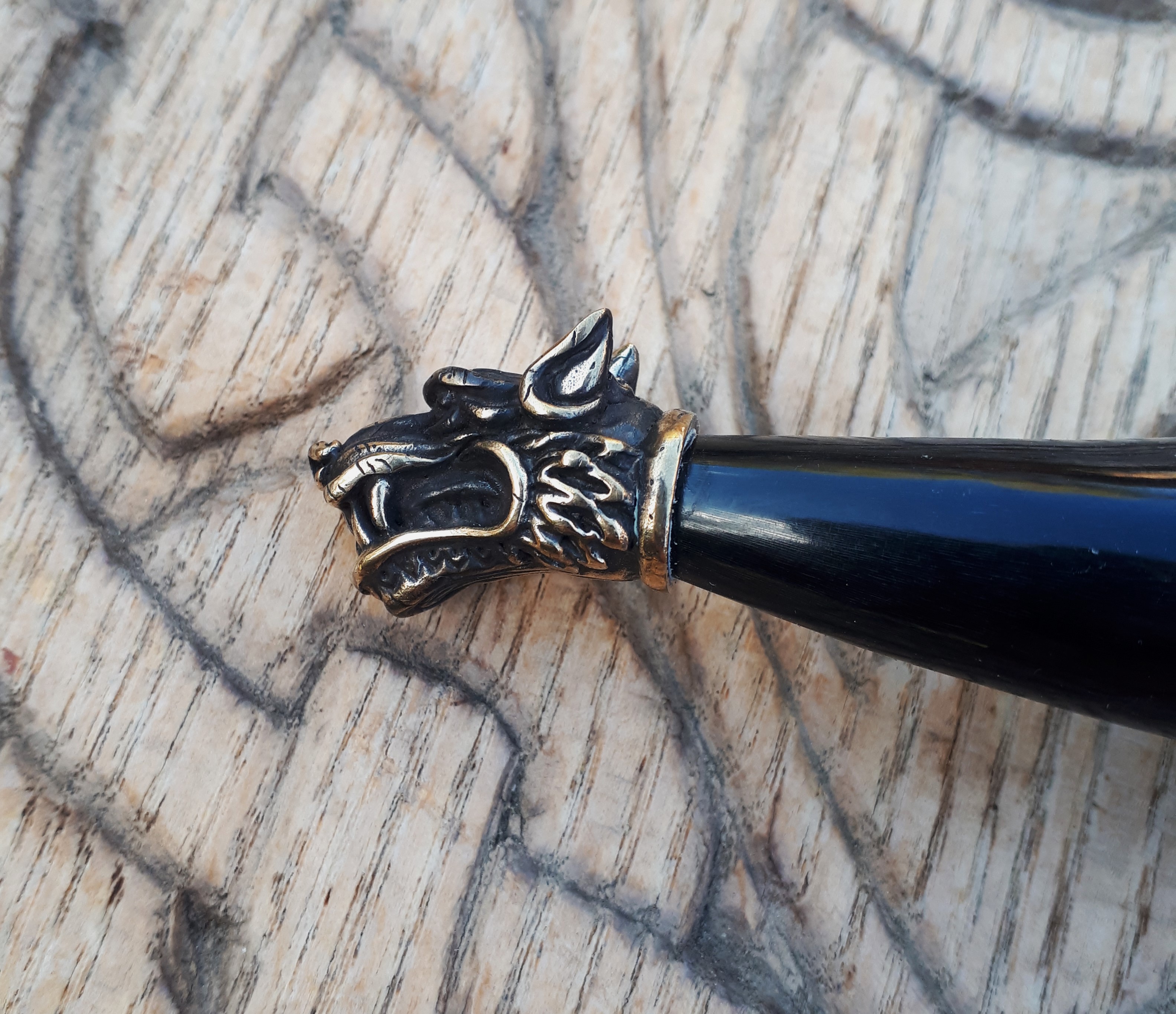 Zakończenie rogu zostało okute głową wilka wykonaną z wysokiej jakości brązu.
