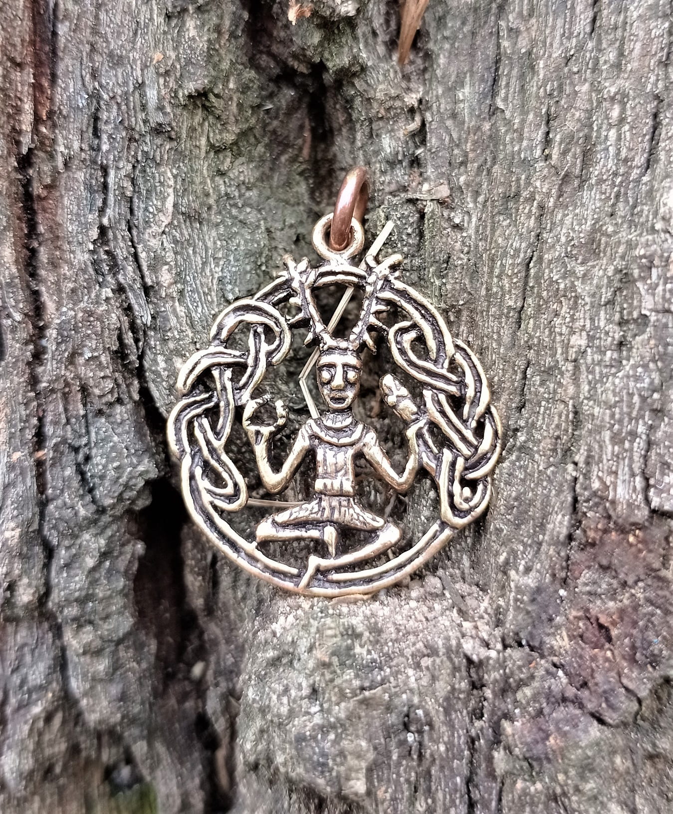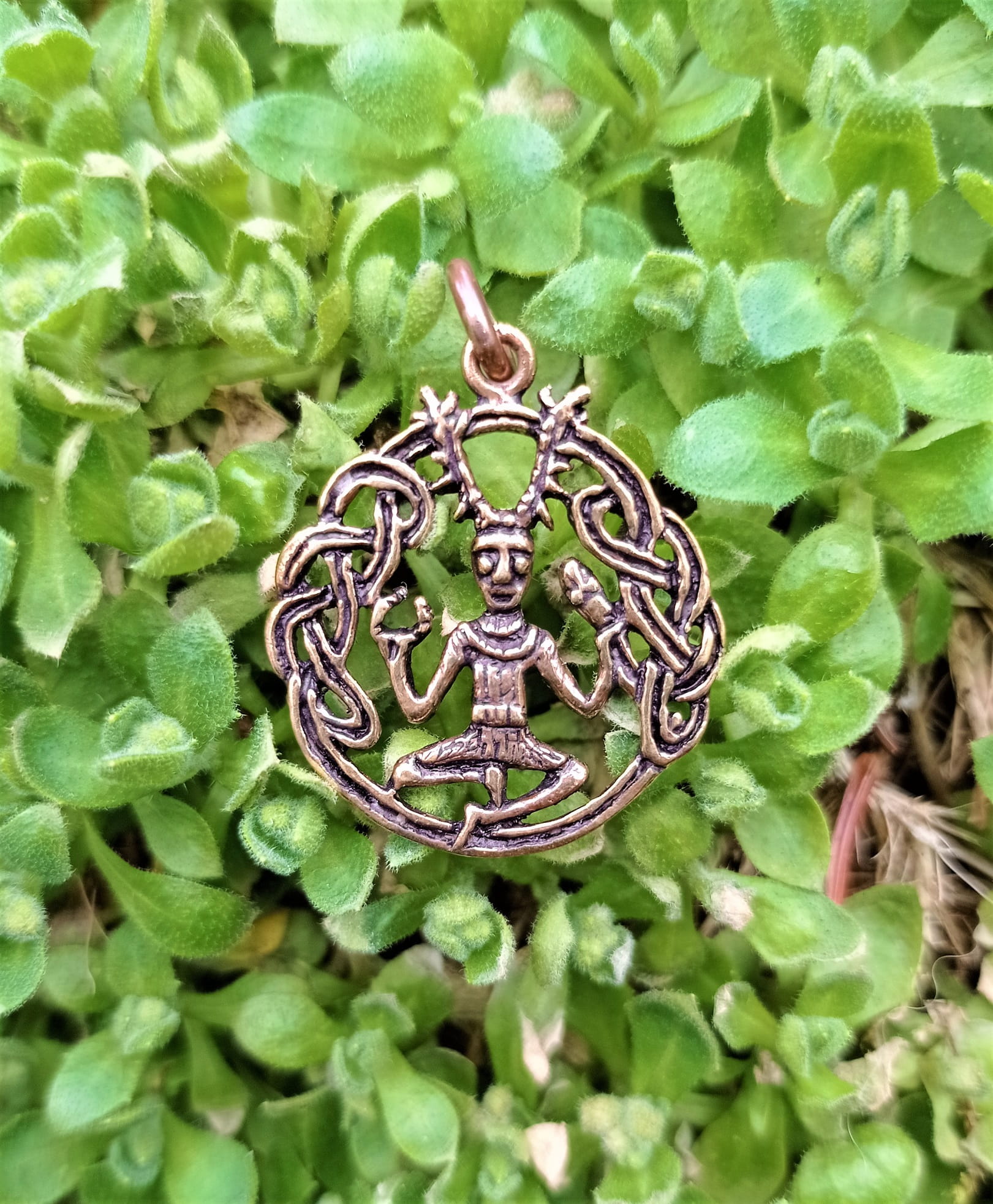 Cernunnos, pradawny celtycki bóg pod postacią rogatej istoty, w formie brązowej zawieszki.