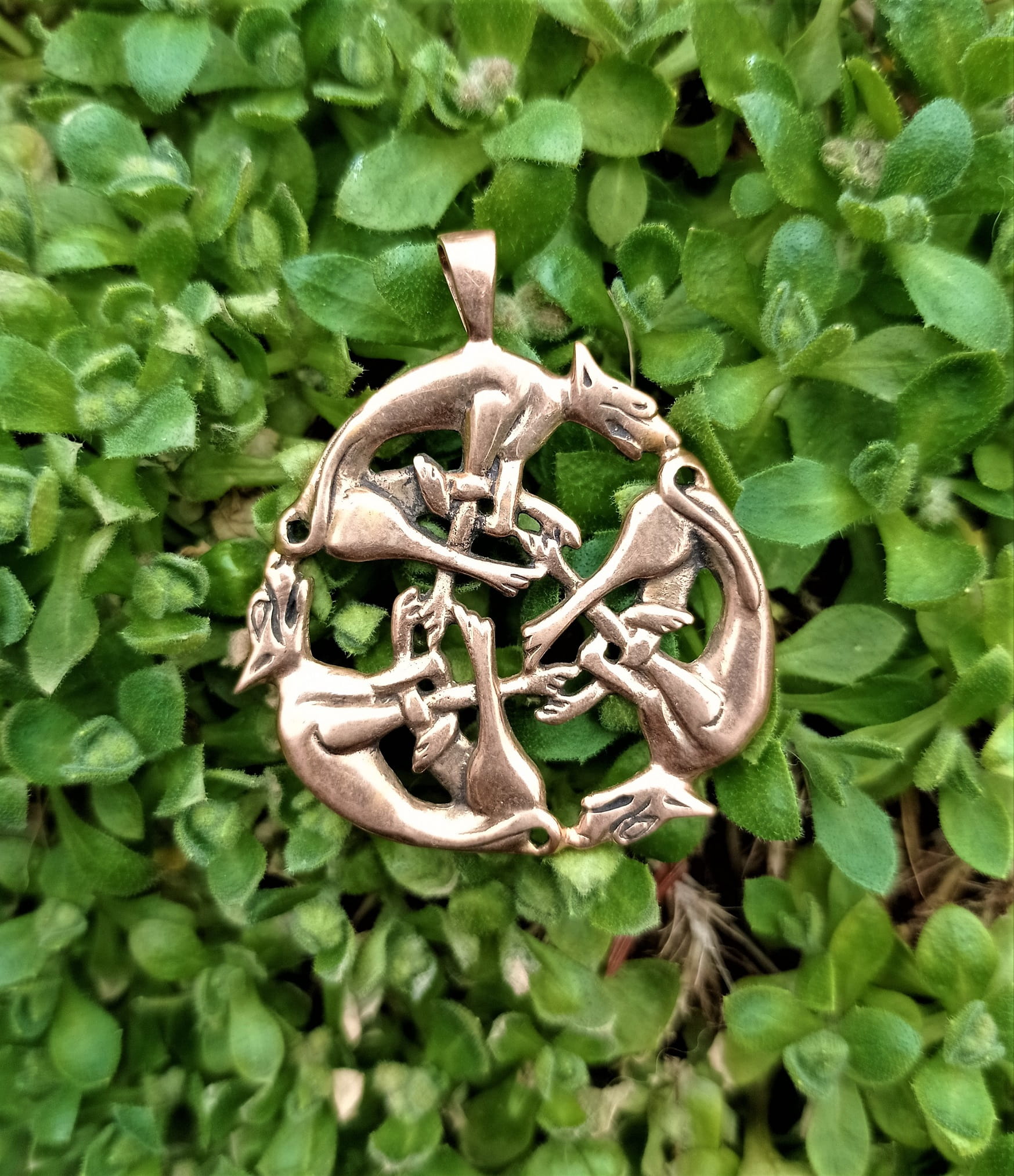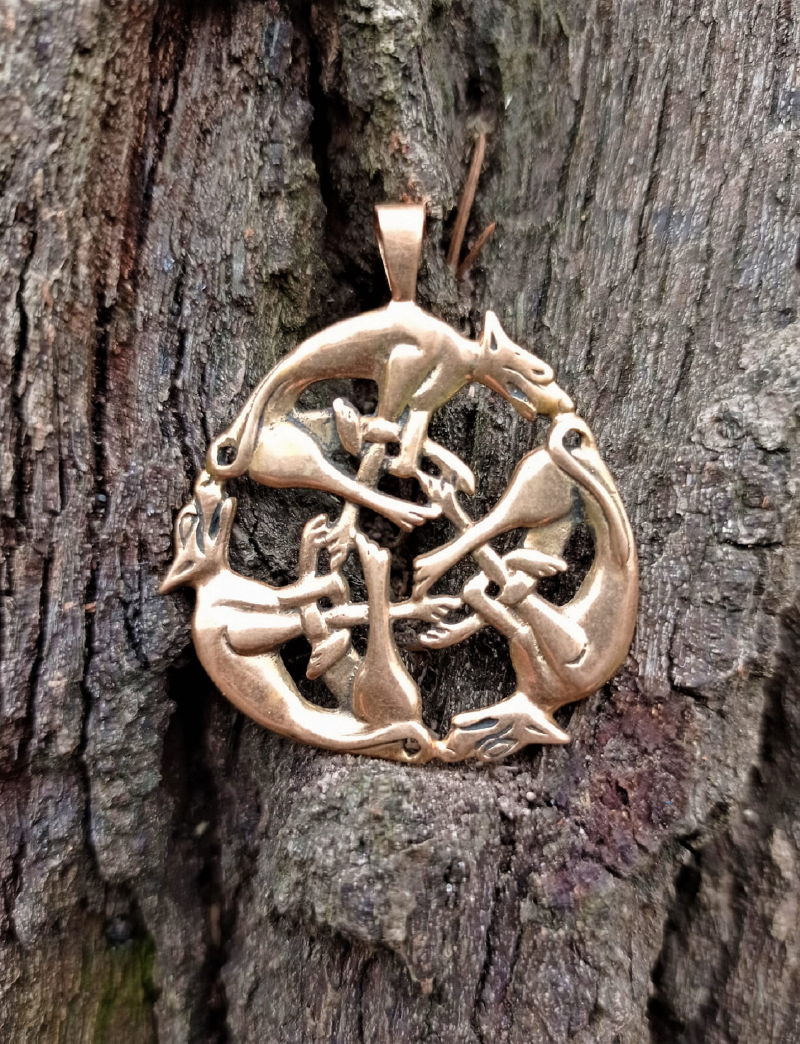 Zawieszka celtycka DZIKIE POLOWANIE to piękny amulet wykonany z brązu. Przedstawia trzy psy, które w ściganiu się tworzą harmonijną kompozycję. Detale i wygięcia zostały starannie wykonane, co dodaje tej biżuterii uroku i unikalnego charakteru.