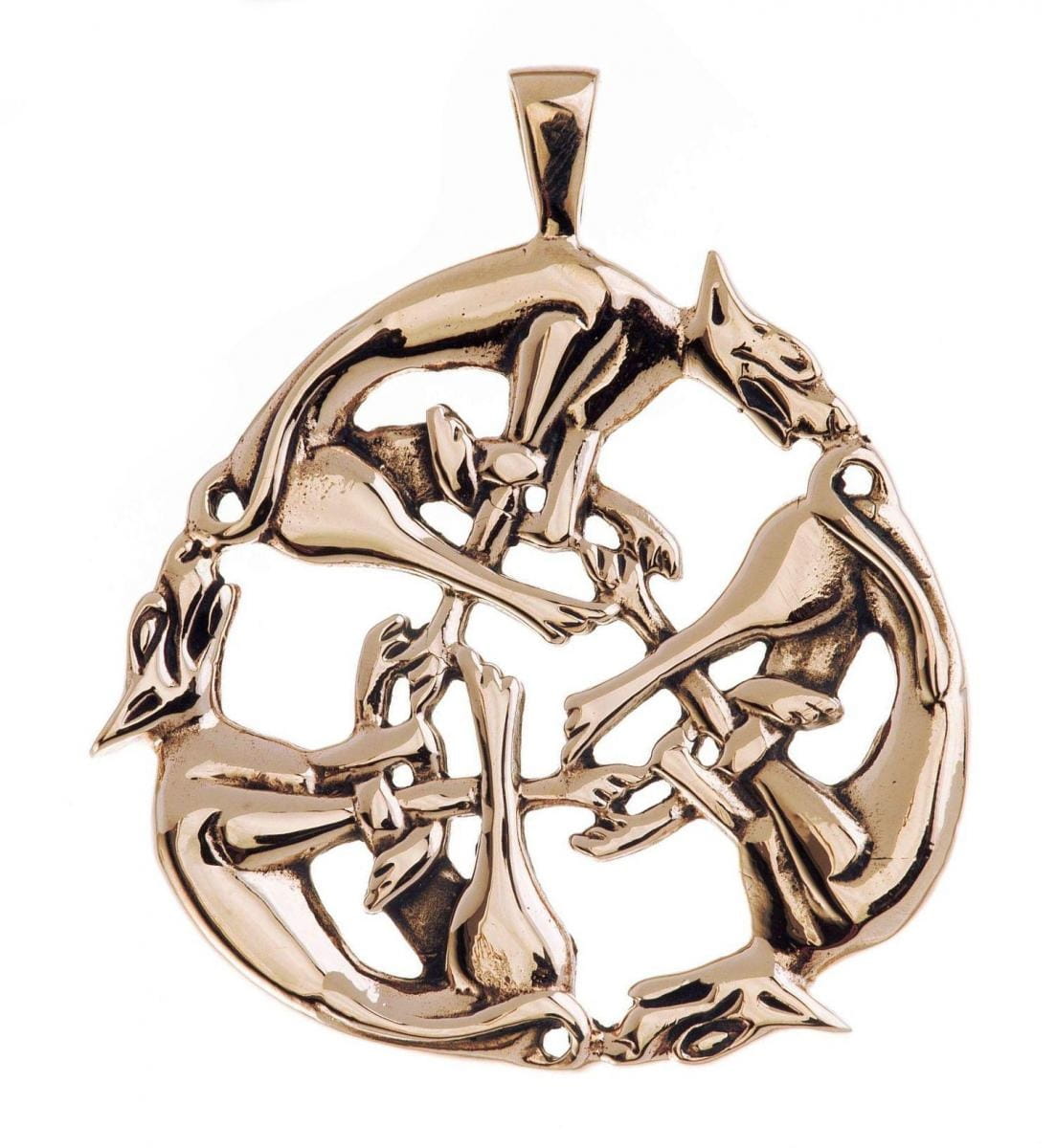 Opowieści o dzikim polowaniu są powszechne w wielu baśniach i legendach. Przedstawione na zawieszce trzy celtyckie psy symbolizują dynamiczne pościgi i siłę. Ta symbolika nawiązuje do historii myśliwego Herne i jego zwolenników, którzy podczas burzy poruszają się po nocnym niebie.