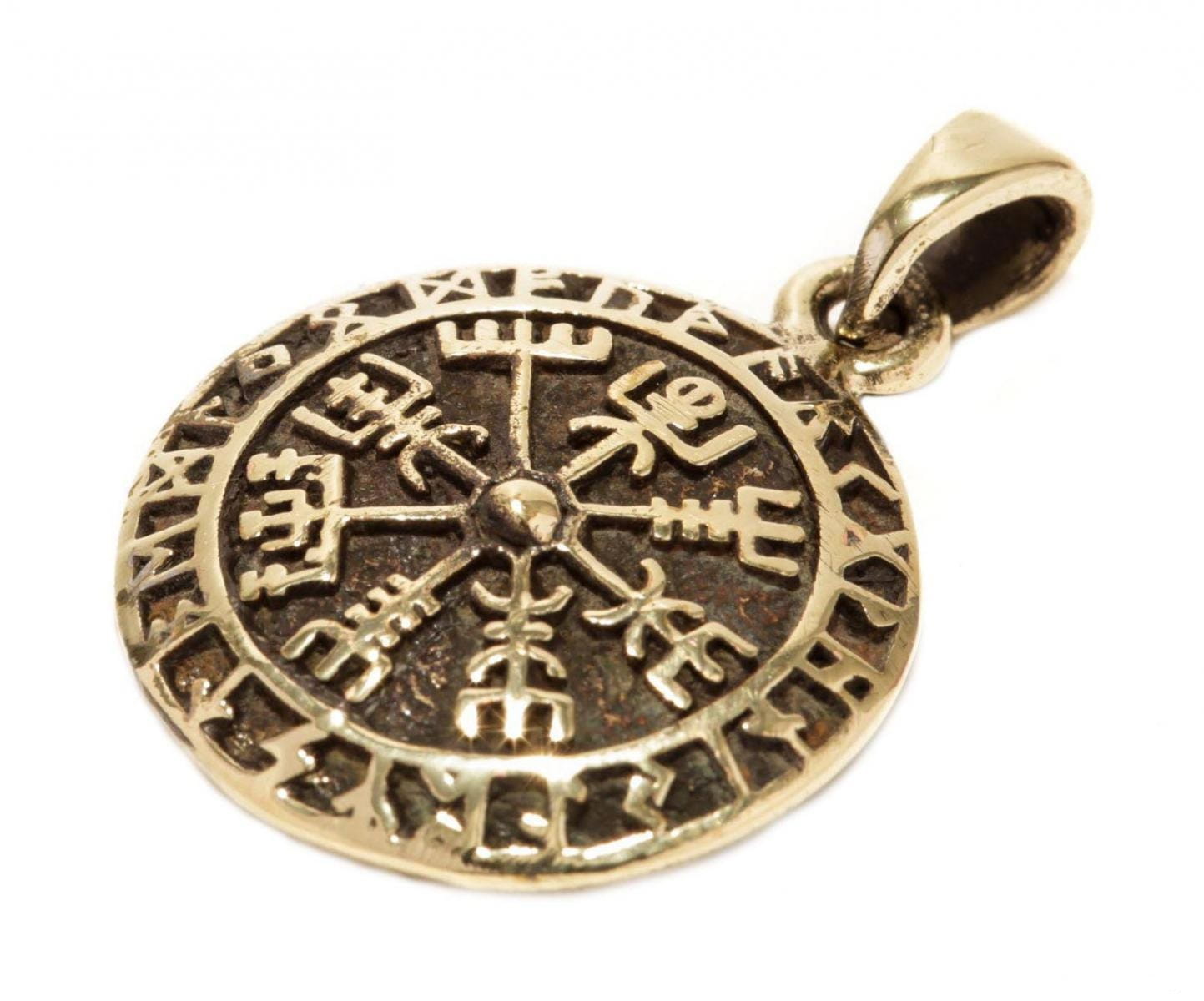 Zawieszka wikińska KOMPAS WIKIŃSKI to magiczny amulet wykonany z brązu. Przedstawia on Vegvisir, symbol wikingów będący kompasem wskazującym drogę. Ten mały, ale potężny amulet jest pełen czystej mocy. Będzie Ci towarzyszyć na wszystkich ścieżkach życia i wskazywać właściwy kierunek. Talizar otoczony jest runami, co dodaje brązowemu wisiorowi dodatkowego charakteru wikinga. Zafunduj sobie tę potężną biżuterię i ciesz się magicznym przewodnictwem, które ona oferuje.